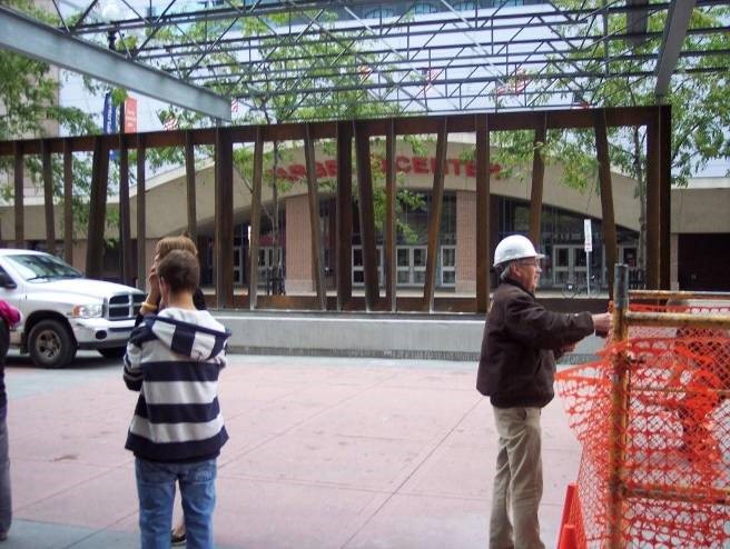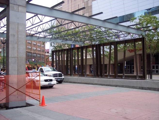 34 ft. 4 in. x 48 ft. new canopy structure with a 50 ft. long custom screen wall below canopy. The screen wall is a Corten Steel screen wall consisting of angles welded to each other in an interesting pattern.